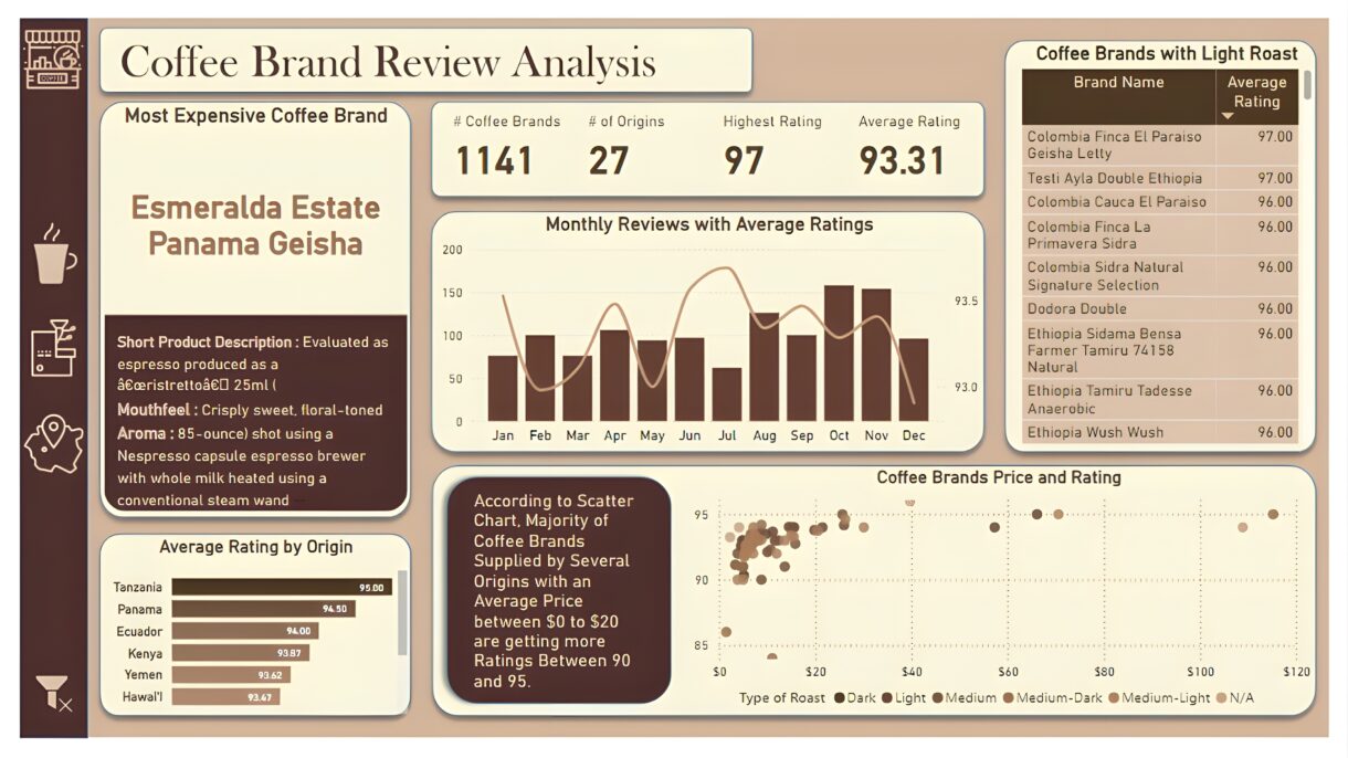 Overview Dashboard: The first report page provides a high-level view of overall performance. We used card visuals to present Key Performance Indicators such as number of coffee brands, number of origins, highest rating, and average rating. We also included additional card to present the most expensive coffee brand including its short product description, mouthfeel and aroma, a line and column chart to display monthly reviews with average ratings, a bar chart to show top 10 origins with average rating, a matrix that displays coffee brands with light roast, and a scatter chart to show relationship between coffee price and ratings.